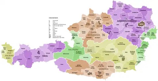 L’Autriche est divisée en 79 districts politiques (en allemand, politische Bezirke), ainsi que 15 villes statutaires (Statutarstädte) aussi appelée villes à statut propre (Städte mit eigenem Statut) qui forment leurs propres districts (souvent enclavé dans un des autres districts)[1].