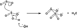 En solution aqueuse, l'ion disulfite se forme en petites quantités par déshydratation de bisulfite par l'équilibre :