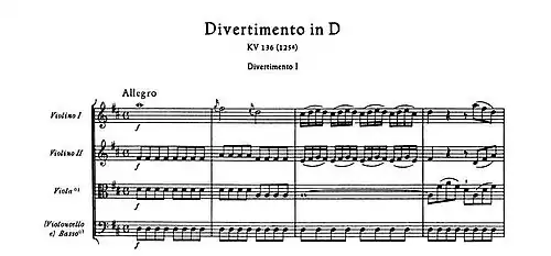 Mozart a composé différents types de divertimentos, prenant même quelquefois la forme de petites symphonies, par exemple les « Symphonies » de Salzbourg KV 136-137-138. D'autres compositeurs, notamment Leopold Mozart, Carl Stamitz, Jommelli, Boccherini (opus 16), Michael et Joseph Haydn[3], ont également composé des divertimentos.