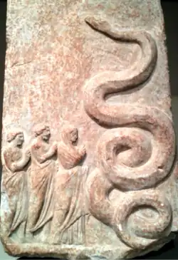 L'art permet aux fidèles de se familiariser avec les divinités et de se forger une image mentale de ceux-ci[171]. Les divinités sont généralement représentées sous forme humaine. Leur supériorité sur les humains se représente souvent par le fait qu'elles sont plus grandes qu'eux lorsqu'elles figurent sur un même bas-relief[56]. Chaque divinité majeure est caractérisée par une apparence-type : Zeus et Poséidon sont des hommes d'âge mûr barbus, Apollon en revanche est jeune et glabre ; Héra porte le voile du mariage, Aphrodite peut être représentée nue à la différence de la première, en raisons de leurs domaines de compétence respectifs[56]. Les divinités ont plus largement une iconographie qui lui est spécifique, notamment des attributs (objets, plantes ou animaux) permettant leur identification, qui les symbolisent et renvoient souvent à leurs fonctions[172],[173] : le foudre de Zeus, le trident de Poséidon, la chouette d'Athéna, la gerbe de céréales de Déméter, etc. Ce canon artistique se développe progressivement à partir de la fin de l'époque archaïque, de manière à distinguer les représentations des divinités et des humains, qui sont semblables en raison de l’anthropomorphisme divin[174]. L'art, et notamment l'iconographie issue de la statue de culte, est donc souvent vu comme un élément d'uniformisation des figures divines dans le monde grec antique. Mais il peut aussi servir à en individualiser certaines par rapport à celles avec laquelle elles partagent un même nom panhellénique : Zeus Meilichios est souvent figuré sous la forme d'un serpent, Artémis d’Éphèse est aussi représentée sous un aspect caractéristique[175], ce qui est en fin de compte une manière de montrer qu'elle est distincte des autres Artémis et non interchangeable avec elles[176].