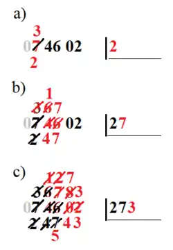 - c) On cherche le plus grand chiffre tel que : c'est , puis on calcule le reste : .