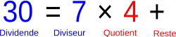 On dit alors que la division de 30 par 7 a pour quotient 4 et pour reste 2 et l'on écrit :
