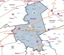 Le 10e district congressionnel de Pennsylvanie est actuellement situé dans la région centre-sud de l'État. Il englobe tout le comté de Dauphin ainsi que certaines parties des comtés de Cumberland et de York. Le district comprend les villes de Harrisburg et York. Avant 2019, le district était situé dans la partie nord-est de l'État. La Cour suprême de Pennsylvanie a redessiné le district en 2018 après avoir jugé la carte précédente inconstitutionnelle en raison du gerrymandering. Le tribunal a ajouté le State College aux limites de l'ancien district tout en supprimant certaines zones à tendance démocrate et l'a rebaptisé 12e district ; une zone englobant Harrisburg et York était numérotée 10e. Le nouveau 10e district est représenté par le Républicain Scott Perry, qui représentait auparavant l'ancien 4e district[1].