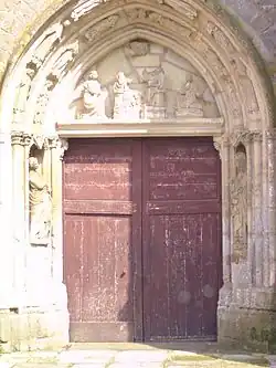 La tour-clocher ainsi que le portail d'entrée occidental de la nef datent de la fin du XIIIe siècle. Le portail est décoré de sculptures gothiques, notamment d'une scène du Couronnement de la Vierge au tympan et de deux piédroits représentant la Vierge Marie (à droite) et l'Archange Gabriel de l'Annonciation (à gauche) et un cordon d'anges thuriféraires aux voussures qui portent des encensoirs[26]. La nef à quatre travées date aussi de la fin du XIIIe siècle et a été voûtée au XVIe siècle. Les bas-côtés plafonnés avec chapiteaux feuillagés à crochets et le chœur à chevet plat sont aussi de la même époque, en art gothique[15]. Les deux cloches datent de 1564[26].