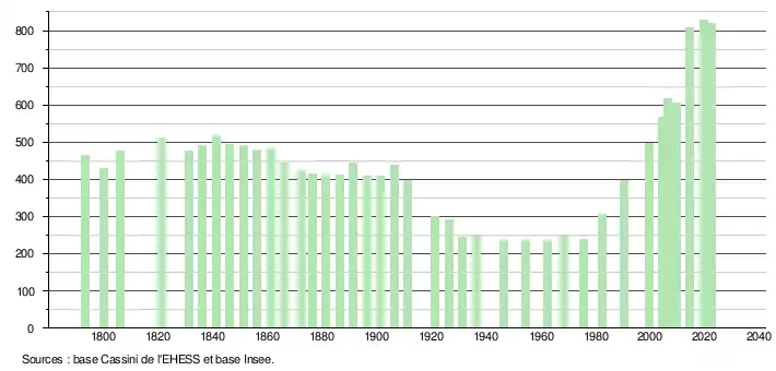 L'évolution du nombre d'habitants est connue à travers les recensements de la population effectués dans la commune depuis 1793. Pour les communes de moins de 10 000 habitants, une enquête de recensement portant sur toute la population est réalisée tous les cinq ans, les populations de référence des années intermédiaires étant quant à elles estimées par interpolation ou extrapolation[32]. Pour la commune, le premier recensement exhaustif entrant dans le cadre du nouveau dispositif a été réalisé en 2004[33].