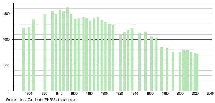 L'évolution du nombre d'habitants est connue à travers les recensements de la population effectués dans la commune depuis 1793. Pour les communes de moins de 10 000 habitants, une enquête de recensement portant sur toute la population est réalisée tous les cinq ans, les populations de référence des années intermédiaires étant quant à elles estimées par interpolation ou extrapolation[22]. Pour la commune, le premier recensement exhaustif entrant dans le cadre du nouveau dispositif a été réalisé en 2004[23].
