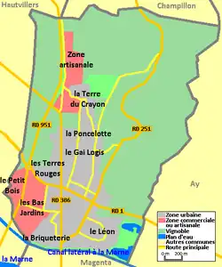 La commune s'étend sur 3,23 km2[4]. Elle est limitrophe des communes de Champillon au nord, Aÿ-Champagne à l'est, Magenta au sud et Hautvillers à l'ouest. Un quadripoint avec la commune d'Épernay se trouve également au sud[1].