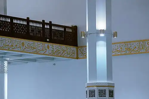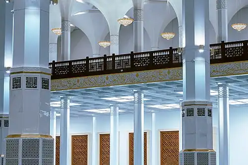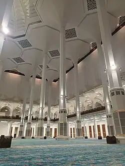 La mosquée compte une salle de prière d'une superficie de 20 000 m2[2]. La nef centrale de cette salle de prière est entourée de colonnades. Dans la partie est de la salle se trouve le mihrab, réalisé en marbre blanc, qui est utilisé par l'imam pour diriger les cinq prières de la journée. Dans cette partie on trouve le minbar, une haute chaire utilisée comme prêchoir. L'agencement architectonique de cette salle repose sur 618 colonnes octogonales blanches. Ces colonnes ont été fabriquées et livrées par la société allemande Europoles (de). Ces 618 piliers octogonaux en béton, dont les 32 plus grands sont divisés en 3 parties, présentent une longueur totale de 34 m pour un diamètre de 1,62 m.