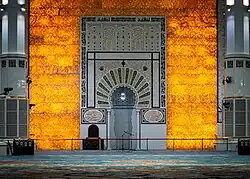 Cet hémisphère, d'un diamètre de 50 mètres, culmine à une hauteur de 70 mètres en couronnant la salle de prière[46]. Ainsi que le toit de la salle de prière qui s'élève à 45 m de haut supporte la coupole de 50 m de diamètre et d'une hauteur de 70 mètres[47],[48]. La Coupole est équipée d'un paratonnerre de 6,5 mètres, orné de trois boules et d'un gigantesque croissant de lune, le tout entièrement recouvert de feuilles d'or[49].