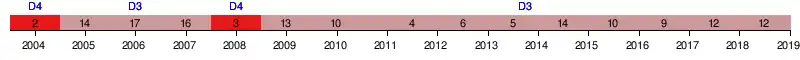 | 2005 | 3e Ouest | 14e | 30 | 32 | 8 | 6 | 18 | 38 | 49 | -11 | |