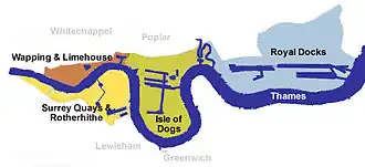 La zone désignée par le nom de Docklands, située principalement sur la berge nord de la Tamise, est constituée des anciens terrains appartenant au port de Londres mais ne comprend pas l'ensemble des installations portuaires situées au bord du fleuve. D'autres quais et appontements sont situés le long de la Tamise mais seulement quelques-uns, principalement situés à Greenwich, sont encore en service et dont principalement partie des Docklands.