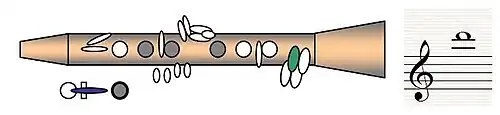 Cette note peut être particulièrement fausse (souvent trop haute). Sur les notes tenues, il convient de pratiquer un léger relâchement de l'embouchure pour corriger, ou de boucher certains des principaux trous du corps inférieur. |