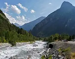 La Doire de Ferret à Entrèves avec le massif du Mont-Blanc sur la gauche. | |