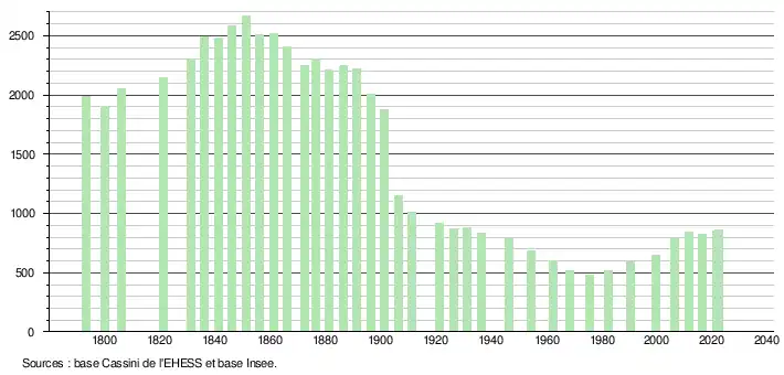 L'évolution du nombre d'habitants est connue à travers les recensements de la population effectués dans la commune depuis 1793. Pour les communes de moins de 10 000 habitants, une enquête de recensement portant sur toute la population est réalisée tous les cinq ans, les populations de référence des années intermédiaires étant quant à elles estimées par interpolation ou extrapolation[19]. Pour la commune, le premier recensement exhaustif entrant dans le cadre du nouveau dispositif a été réalisé en 2006[20].
