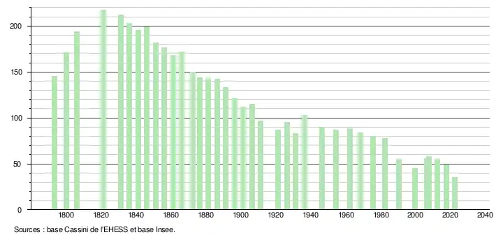 L'évolution du nombre d'habitants est connue à travers les recensements de la population effectués dans la commune depuis 1793. Pour les communes de moins de 10 000 habitants, une enquête de recensement portant sur toute la population est réalisée tous les cinq ans, les populations de référence des années intermédiaires étant quant à elles estimées par interpolation ou extrapolation[27]. Pour la commune, le premier recensement exhaustif entrant dans le cadre du nouveau dispositif a été réalisé en 2007[28].
