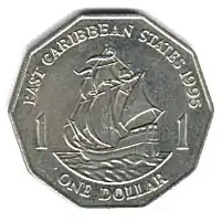 En 1981, une nouvelle série de pièces a été introduite dans les mêmes dénominations, mais l'effigie royale a été remplacée par des palmes pour les pièces de 1, 2 ou 5 cents, ou un voilier pour les autres pièces ; toutes ces pièces mentionnent EAST CARIBBEAN STATES. La taille et les formes de pièces ont été conservées sauf pour la première série de pièces de 1 dollar :