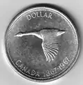 En 1935, un dollar commémoratif en argent a été frappé pour le jubilé d'argent du roi George V. Il représentait le roi sur l'avers et un canot contenant un voyageur (négociant en fourrures Canadien français) et un autochtone sur le revers. Le canot contient également deux paquets de fourrures : sur l'un d'eux, on peut voir les initiales HB de la Compagnie de la Baie d'Hudson. Le revers a été conçu par Emanuel Hahn[4]. Cette pièce a marqué le début de la circulation des dollars canadiens en argent, qui s'est poursuivie jusqu'en 1968, lorsque la composition de la pièce est passée de l'argent au nickel[5].