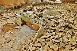 Quelques ossements humains très fragmentés difficilement identifiables et des ossements d'animaux (suidé et ovicapridé) ont été retrouvés sur le dallage et le matériel funéraire est pauvre (un fragment de vase de couleur brun-noir à pâte rugueuse mal cuite et gros dégraissant calcaire, quatre autres fragments de vase)[1].