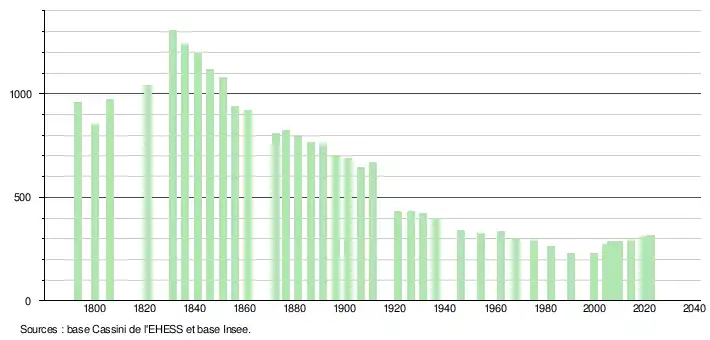 L'évolution du nombre d'habitants est connue à travers les recensements de la population effectués dans la commune depuis 1793. Pour les communes de moins de 10 000 habitants, une enquête de recensement portant sur toute la population est réalisée tous les cinq ans, les populations de référence des années intermédiaires étant quant à elles estimées par interpolation ou extrapolation[22]. Pour la commune, le premier recensement exhaustif entrant dans le cadre du nouveau dispositif a été réalisé en 2004[23].