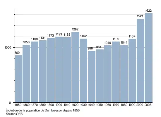 Le graphique suivant résume l'évolution de la population de Dombresson entre 1850 et 2008[4] :