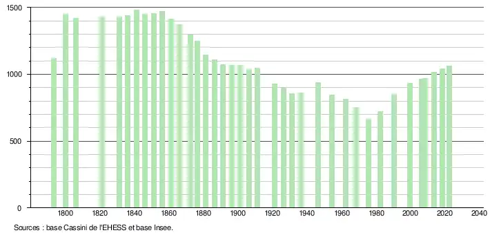 L'évolution du nombre d'habitants est connue à travers les recensements de la population effectués dans la commune depuis 1793. Pour les communes de moins de 10 000 habitants, une enquête de recensement portant sur toute la population est réalisée tous les cinq ans, les populations de référence des années intermédiaires étant quant à elles estimées par interpolation ou extrapolation[14]. Pour la commune, le premier recensement exhaustif entrant dans le cadre du nouveau dispositif a été réalisé en 2008[15].