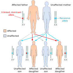 Chez l’espèce humaine et certaines autres espèces animales, le sexe des individus est déterminé par 2 gonosomes (chromosomes sexuels) appelés chromosome X et chromosome Y[16]. Les femelles portent deux chromosomes X (XX) tandis que les mâles portent un chromosome X et un chromosome Y (XY). Le reste du caryotype est commun aux deux sexes et est composé de chromosomes non sexuels appelés autosomes[17]. Les caractères génétiques associés aux gènes portés par ces chromosomes sont dits autosomiques et peuvent être dominants ou récessifs. Les caractères génétiques associés aux chromosomes X et Y sont, quant-à-eux, dits « liés au sexe » ou gonosomiques. On leur doit cette appellation en raison de leur lien physique avec les gonosomes et non car ils sont caractéristiques d’un sexe en particulier. Dans les faits, le terme « lié au sexe » fait presque toujours référence aux caractères lié à l’X et un grand nombre d’entre eux (tels que la déficience de la vision des couleurs rouge et verte) ne sont pas affectés par le sexe. Les femelles possèdent donc deux copies de chacun de leurs gènes localisés sur le chromosome X, comme pour les autosomes de leur caryotype, avec les mêmes relations de dominance et de récessivité entre les allèles. Cependant, les mâles ne possèdent qu’une seule copie des gènes portés par le chromosome X, ils sont ainsi considérés comme hétérozygotes pour ces gènes. Le chromosome Y, quant-à lui, est beaucoup plus petit que le chromosome X et porte donc moins de gènes. Parmi ces gènes se trouvent ceux responsables des caractères dits « masculins » comme, le gène SRY (ou TDF pour ‘facteur déterminant des testicules’ en français) qui inhibe le développement de la gonade en ovaire et favorise donc le développement des testicules. Les règles de la dominance des gènes liés au sexe sont donc déterminées par le comportement des allèles au sein du génotype des femelles car le génotype mâle ayant un seul allèle associé à l’X (sauf dans le cas d’une aneuploïdie), cet unique allèle est alors systématiquement exprimé, qu’il soit dominant ou non[18].