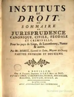 - ↑ Hugues Richard, « Le droit international privé dans l’œuvre de Dominique-François de Sohet (1728-1811), juriste liégeois de la fin du XVIIIe siècle », Cahiers du Centre de recherche en histoire du droit et des institutions, Bruxelles, Facultés universitaires Saint-Louis, nos 11-12, (lire en ligne)
