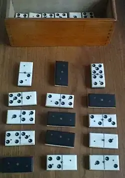 Les dominos sont des pièces rectangulaires sur lesquelles figurent, sur une de leurs faces, deux ensembles de points séparés par un trait. Les dominos étaient autrefois faits de matières diverses telles que l'ivoire, l'os ou le bois, la bakélite, puis d'autres matières plastiques. Un rivet métallique (souvent en laiton) peut être implanté au centre du domino et permet de faciliter le mélange des pièces[3].