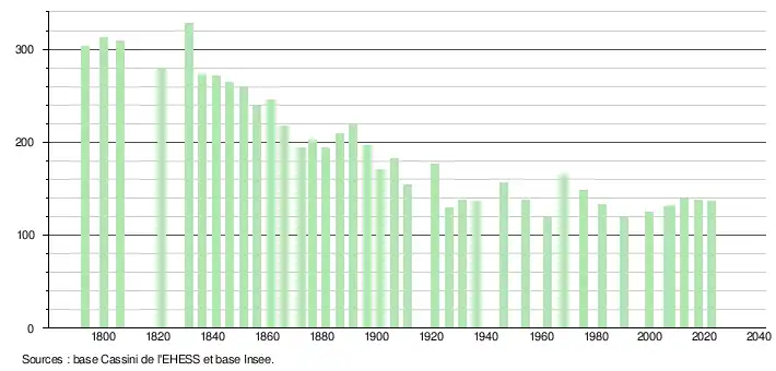 L'évolution du nombre d'habitants est connue à travers les recensements de la population effectués dans la commune depuis 1793. Pour les communes de moins de 10 000 habitants, une enquête de recensement portant sur toute la population est réalisée tous les cinq ans, les populations de référence des années intermédiaires étant quant à elles estimées par interpolation ou extrapolation[30]. Pour la commune, le premier recensement exhaustif entrant dans le cadre du nouveau dispositif a été réalisé en 2007[31].