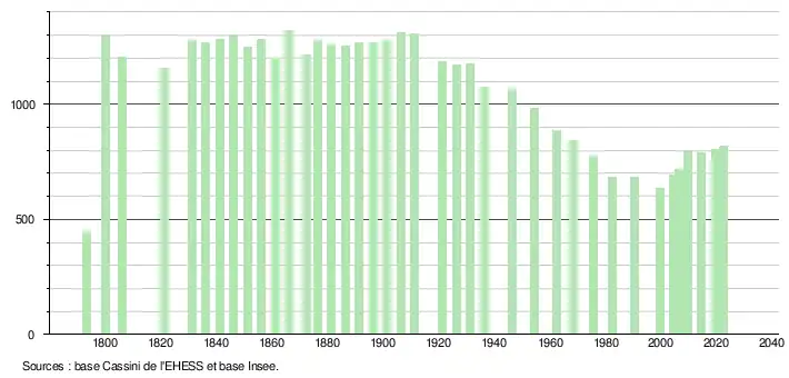 L'évolution du nombre d'habitants est connue à travers les recensements de la population effectués dans la commune depuis 1793. Pour les communes de moins de 10 000 habitants, une enquête de recensement portant sur toute la population est réalisée tous les cinq ans, les populations de référence des années intermédiaires étant quant à elles estimées par interpolation ou extrapolation[18]. Pour la commune, le premier recensement exhaustif entrant dans le cadre du nouveau dispositif a été réalisé en 2004[19].