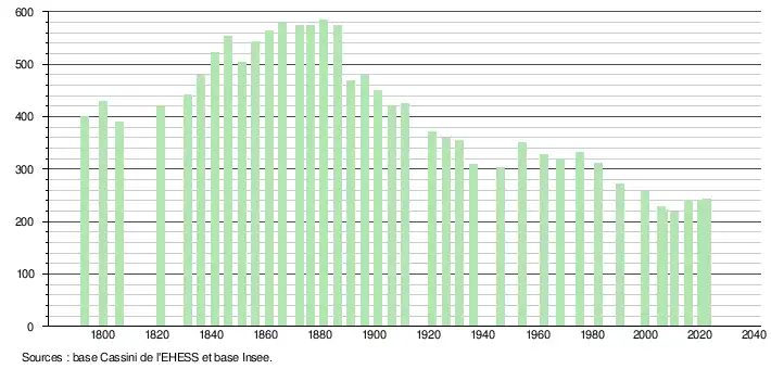 L'évolution du nombre d'habitants est connue à travers les recensements de la population effectués dans la commune depuis 1793. Pour les communes de moins de 10 000 habitants, une enquête de recensement portant sur toute la population est réalisée tous les cinq ans, les populations de référence des années intermédiaires étant quant à elles estimées par interpolation ou extrapolation[16]. Pour la commune, le premier recensement exhaustif entrant dans le cadre du nouveau dispositif a été réalisé en 2005[17].