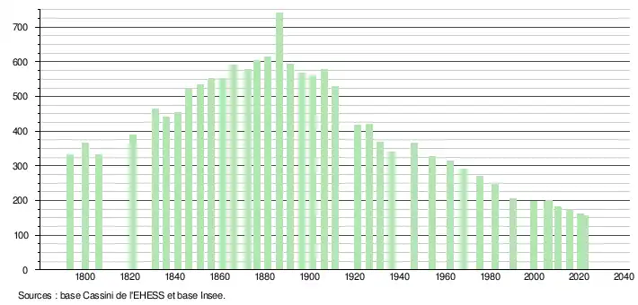 L'évolution du nombre d'habitants est connue à travers les recensements de la population effectués dans la commune depuis 1793. Pour les communes de moins de 10 000 habitants, une enquête de recensement portant sur toute la population est réalisée tous les cinq ans, les populations de référence des années intermédiaires étant quant à elles estimées par interpolation ou extrapolation[13]. Pour la commune, le premier recensement exhaustif entrant dans le cadre du nouveau dispositif a été réalisé en 2005[14].