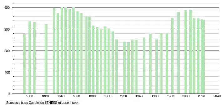 L'évolution du nombre d'habitants est connue à travers les recensements de la population effectués dans la commune depuis 1793. Pour les communes de moins de 10 000 habitants, une enquête de recensement portant sur toute la population est réalisée tous les cinq ans, les populations de référence des années intermédiaires étant quant à elles estimées par interpolation ou extrapolation[34]. Pour la commune, le premier recensement exhaustif entrant dans le cadre du nouveau dispositif a été réalisé en 2005[35].