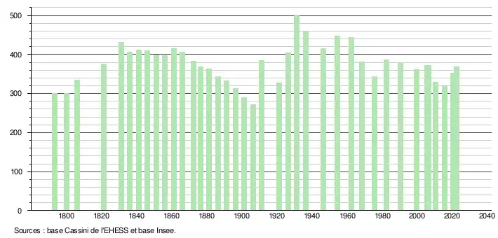 L'évolution du nombre d'habitants est connue à travers les recensements de la population effectués dans la commune depuis 1793. Pour les communes de moins de 10 000 habitants, une enquête de recensement portant sur toute la population est réalisée tous les cinq ans, les populations de référence des années intermédiaires étant quant à elles estimées par interpolation ou extrapolation[21]. Pour la commune, le premier recensement exhaustif entrant dans le cadre du nouveau dispositif a été réalisé en 2005[22].