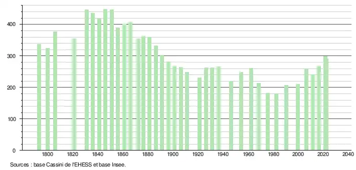 L'évolution du nombre d'habitants est connue à travers les recensements de la population effectués dans la commune depuis 1793. Pour les communes de moins de 10 000 habitants, une enquête de recensement portant sur toute la population est réalisée tous les cinq ans, les populations de référence des années intermédiaires étant quant à elles estimées par interpolation ou extrapolation[17]. Pour la commune, le premier recensement exhaustif entrant dans le cadre du nouveau dispositif a été réalisé en 2006[18].