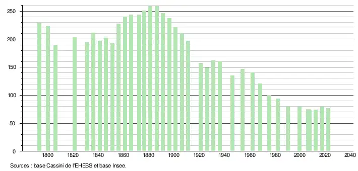 L'évolution du nombre d'habitants est connue à travers les recensements de la population effectués dans la commune depuis 1793. Pour les communes de moins de 10 000 habitants, une enquête de recensement portant sur toute la population est réalisée tous les cinq ans, les populations de référence des années intermédiaires étant quant à elles estimées par interpolation ou extrapolation[15]. Pour la commune, le premier recensement exhaustif entrant dans le cadre du nouveau dispositif a été réalisé en 2007[16].