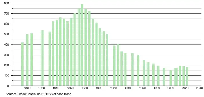 L'évolution du nombre d'habitants est connue à travers les recensements de la population effectués dans la commune depuis 1793. Pour les communes de moins de 10 000 habitants, une enquête de recensement portant sur toute la population est réalisée tous les cinq ans, les populations de référence des années intermédiaires étant quant à elles estimées par interpolation ou extrapolation[32]. Pour la commune, le premier recensement exhaustif entrant dans le cadre du nouveau dispositif a été réalisé en 2007[33].