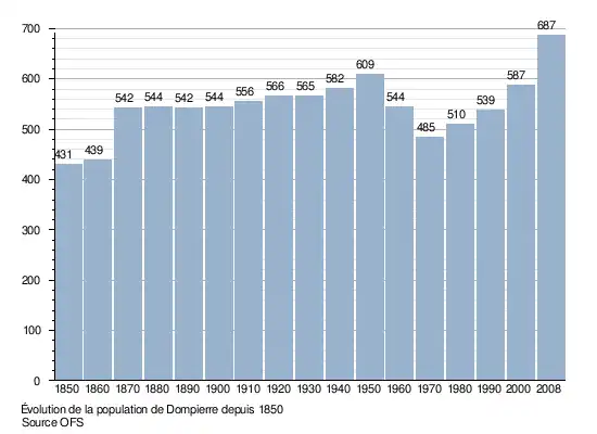 Le graphique suivant résume l'évolution de la population de Dompierre entre 1850 et 2008[3] :