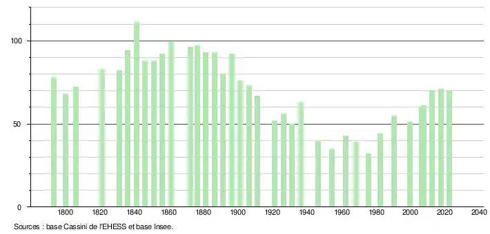 L'évolution du nombre d'habitants est connue à travers les recensements de la population effectués dans la commune depuis 1793. Pour les communes de moins de 10 000 habitants, une enquête de recensement portant sur toute la population est réalisée tous les cinq ans, les populations de référence des années intermédiaires étant quant à elles estimées par interpolation ou extrapolation[24]. Pour la commune, le premier recensement exhaustif entrant dans le cadre du nouveau dispositif a été réalisé en 2007[25].