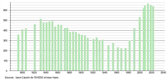 L'évolution du nombre d'habitants est connue à travers les recensements de la population effectués dans la commune depuis 1793. Pour les communes de moins de 10 000 habitants, une enquête de recensement portant sur toute la population est réalisée tous les cinq ans, les populations de référence des années intermédiaires étant quant à elles estimées par interpolation ou extrapolation[18]. Pour la commune, le premier recensement exhaustif entrant dans le cadre du nouveau dispositif a été réalisé en 2008[19].