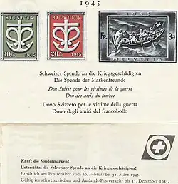 - ↑ « Message du Conseil fédéral à l'Assemblée fédérale concernant le « Don suisse pour les victimes de la guerre». (Du 1er décembre 1944.) » (7 décembre 1944) de la Feuille fédérale référence FF 1944 I 1349
