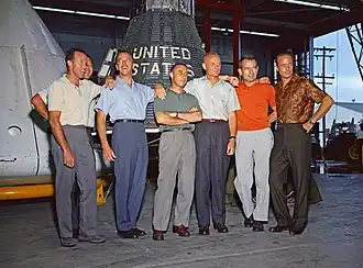 Les Mercury Seven posant devant un vaisseau spatial Mercury le sur une base militaire de Houston. De gauche à droite : Gordon Cooper, Walter Schirra (dit Wally Schirra), Alan Shepard, Virgil Grissom (dit Gus Grissom), John Glenn, Donald Slayton (dit Deke Slayton) et Scott Carpenter.