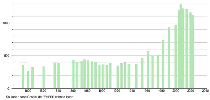 L'évolution du nombre d'habitants est connue à travers les recensements de la population effectués dans la commune depuis 1793. Pour les communes de moins de 10 000 habitants, une enquête de recensement portant sur toute la population est réalisée tous les cinq ans, les populations de référence des années intermédiaires étant quant à elles estimées par interpolation ou extrapolation[26]. Pour la commune, le premier recensement exhaustif entrant dans le cadre du nouveau dispositif a été réalisé en 2004[27].