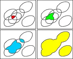 Une approche d'appartenance à l'ensemble considère que l'incertitude correspondant à la mesure d'une variable aléatoire x est représentée par un ensemble Xi (au lieu d'une fonction de densité de probabilité). Si aucune donnée aberrante n’apparaît, x appartient à l'intersection de tous les Xi. Si une donnée aberrante apparaît, cette intersection est vide et nous relâchons un petit nombre de Xi (aussi petit que possible) afin d'éviter toute incohérence[24]. Cela peut être fait en utilisant la notion d'intersection q-relâchée. Comme illustré par la figure, l'intersection q-relâchée correspond à l'ensemble de tous les x qui appartiennent à tous les ensembles Xi excepté q d'entre eux. Les ensembles Xi qui ne coupent pas l'intersection q-relâchée peuvent être soupçonnés de rassembler des données aberrantes.