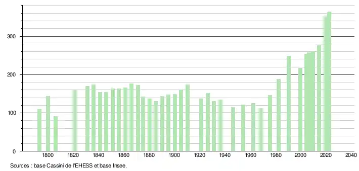 L'évolution du nombre d'habitants est connue à travers les recensements de la population effectués dans la commune depuis 1793. Pour les communes de moins de 10 000 habitants, une enquête de recensement portant sur toute la population est réalisée tous les cinq ans, les populations de référence des années intermédiaires étant quant à elles estimées par interpolation ou extrapolation[22]. Pour la commune, le premier recensement exhaustif entrant dans le cadre du nouveau dispositif a été réalisé en 2004[23].