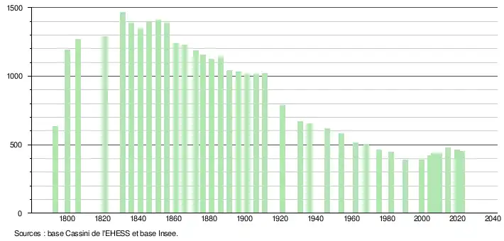 L'évolution du nombre d'habitants est connue à travers les recensements de la population effectués dans la commune depuis 1793. Pour les communes de moins de 10 000 habitants, une enquête de recensement portant sur toute la population est réalisée tous les cinq ans, les populations de référence des années intermédiaires étant quant à elles estimées par interpolation ou extrapolation[25]. Pour la commune, le premier recensement exhaustif entrant dans le cadre du nouveau dispositif a été réalisé en 2004[26].