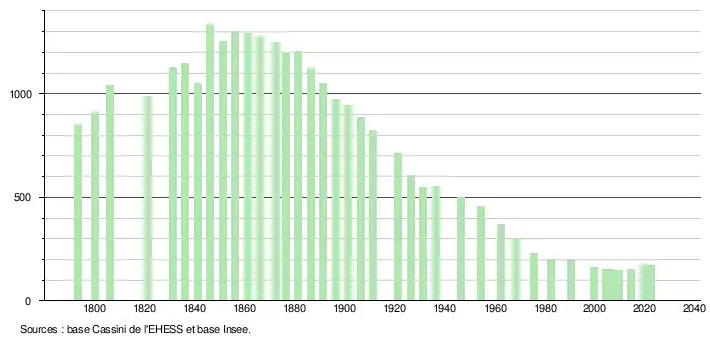 L'évolution du nombre d'habitants est connue à travers les recensements de la population effectués dans la commune depuis 1793. Pour les communes de moins de 10 000 habitants, une enquête de recensement portant sur toute la population est réalisée tous les cinq ans, les populations de référence des années intermédiaires étant quant à elles estimées par interpolation ou extrapolation[16]. Pour la commune, le premier recensement exhaustif entrant dans le cadre du nouveau dispositif a été réalisé en 2004[17].