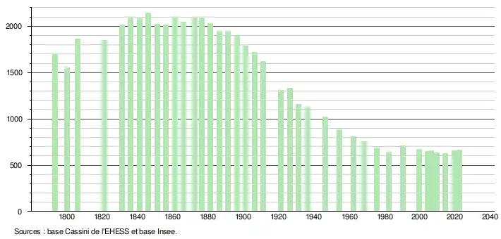 L'évolution du nombre d'habitants est connue à travers les recensements de la population effectués dans la commune depuis 1793. Pour les communes de moins de 10 000 habitants, une enquête de recensement portant sur toute la population est réalisée tous les cinq ans, les populations de référence des années intermédiaires étant quant à elles estimées par interpolation ou extrapolation[17]. Pour la commune, le premier recensement exhaustif entrant dans le cadre du nouveau dispositif a été réalisé en 2004[18].