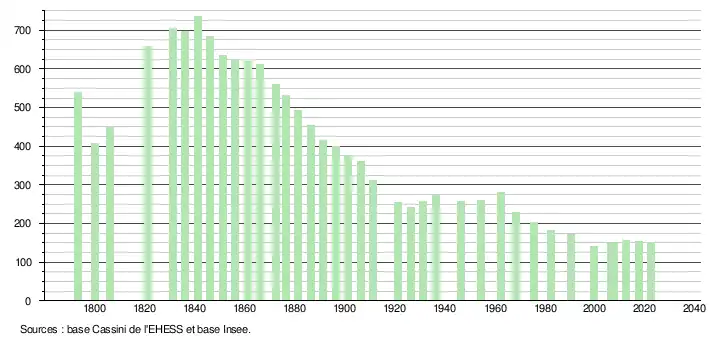 L'évolution du nombre d'habitants est connue à travers les recensements de la population effectués dans la commune depuis 1793. Pour les communes de moins de 10 000 habitants, une enquête de recensement portant sur toute la population est réalisée tous les cinq ans, les populations de référence des années intermédiaires étant quant à elles estimées par interpolation ou extrapolation[28]. Pour la commune, le premier recensement exhaustif entrant dans le cadre du nouveau dispositif a été réalisé en 2007[29].
