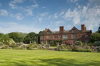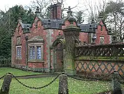 La reconstruction du terrain par William Nesfield en 1861-1862 aboutit à plusieurs structures qui sont maintenant répertoriées. Le pavillon de porte de style jacobéen sur Chester Road est en brique rouge avec des pansements en pierre et une décoration en brique bleue. La tour de l'horloge au-dessus de la remise comporte des cadres en pierre pour les cadrans de l'horloge et est surmontée d'un faîteau en bois avec une girouette. Une grande statue en fer d'un dogue avec des chiots recouvrant un bol de nourriture se dresse sur le parvis de la salle; il est attribué à Pierre Louis Rouillard et provient de l'exposition de Paris de 1855[11].